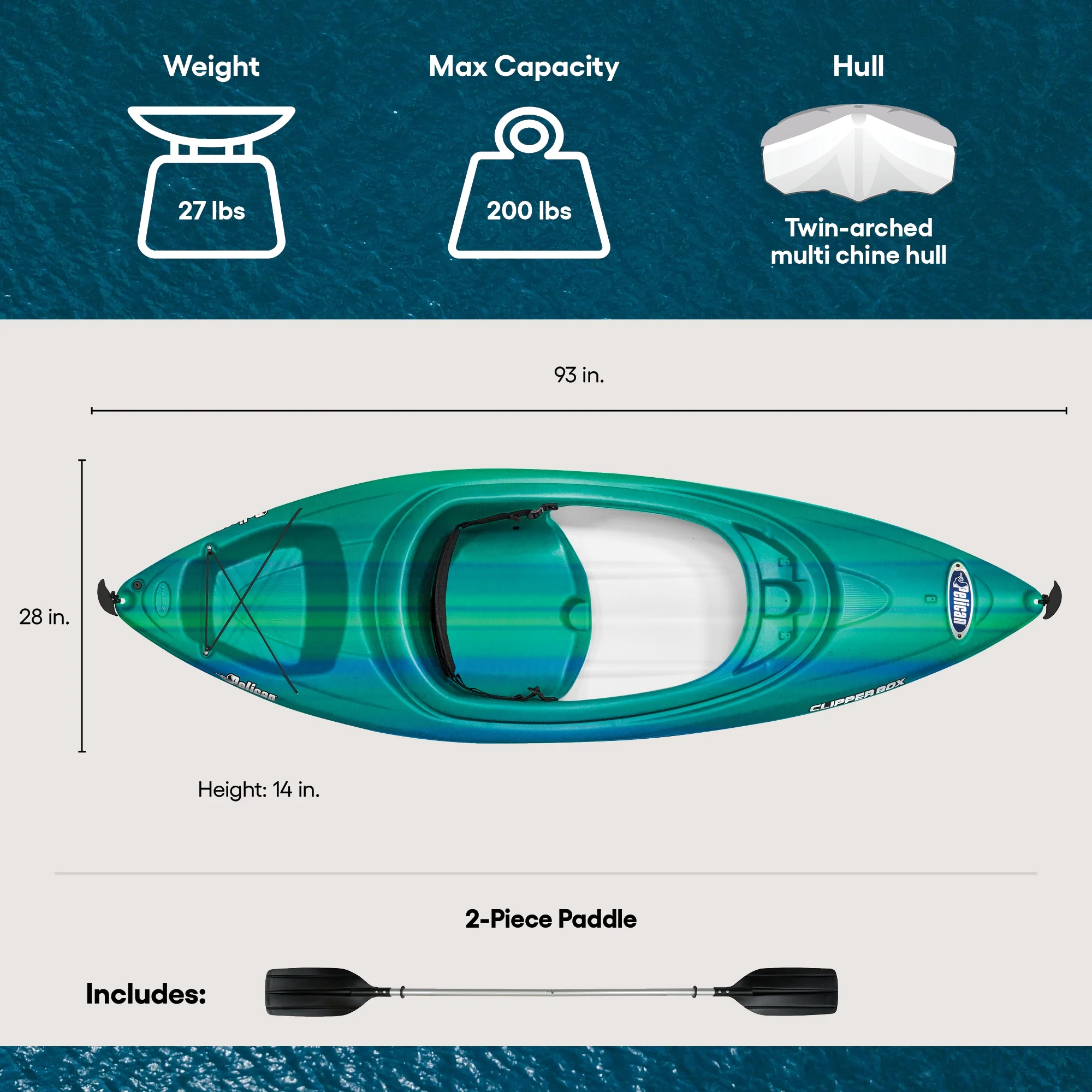 Hull shape: “twin-arched multi-chine hull” — this is Pelican’s design aimed to improve initial stability (resistance to tipping) by increasing the contact surface area when the kayak is upright, so it tracks more steadily and feels more secure, especially for beginners.