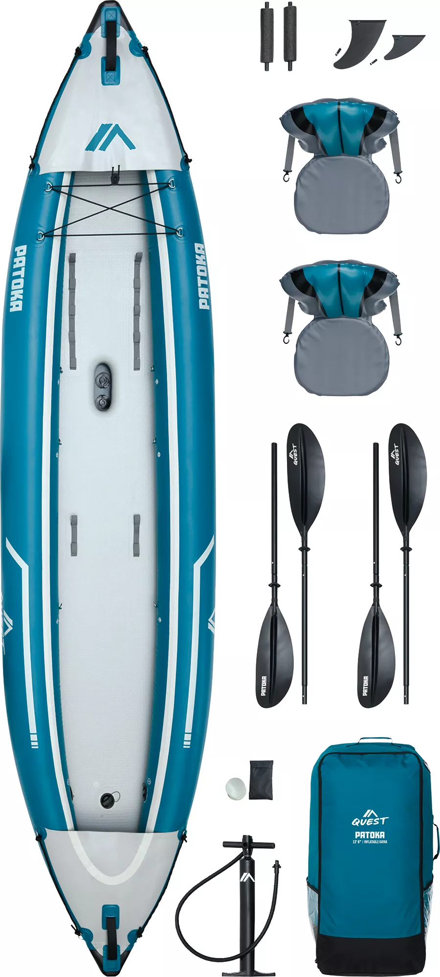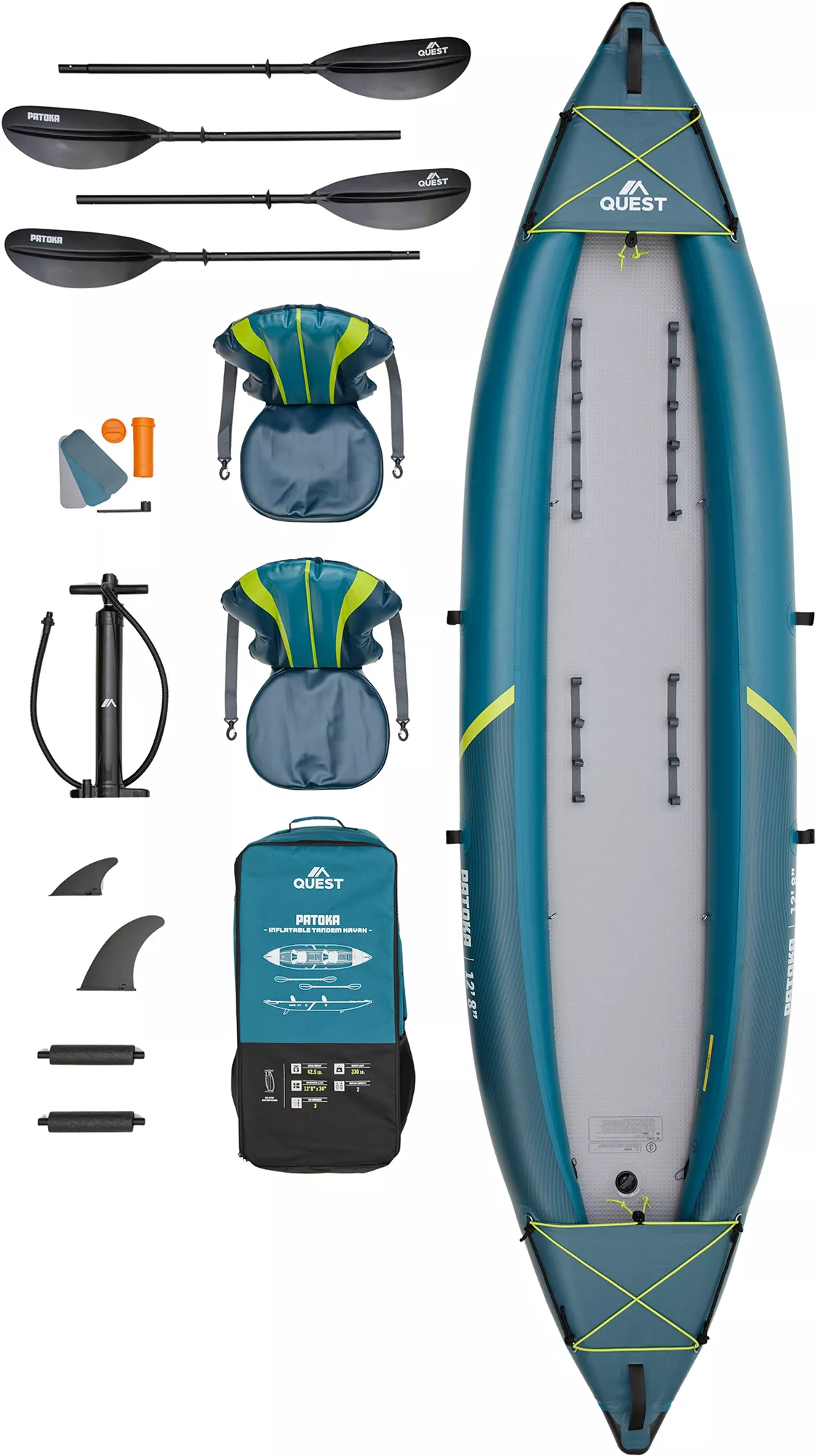 The Quest Patoka is an inflatable tandem kayak designed for recreational paddling. It’s a full package, meaning it comes with most of what you need: seats, paddles, pump, etc. It’s built for people who want the flexibility of inflatables (easy transport, storage) but with enough features and quality to enjoy regular outings.