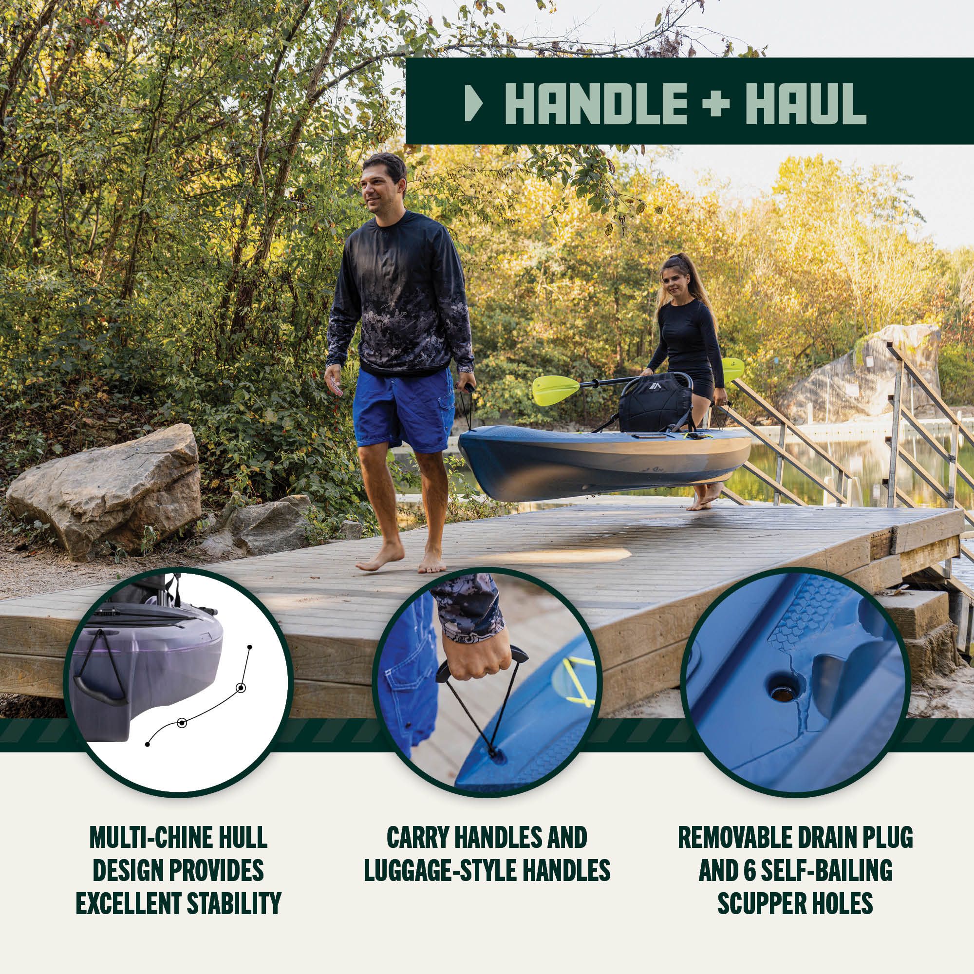 Hull Design: The kayak features a flat bottom with deep tracking channels, enhancing its stability and ease of maneuverability on calm waters.