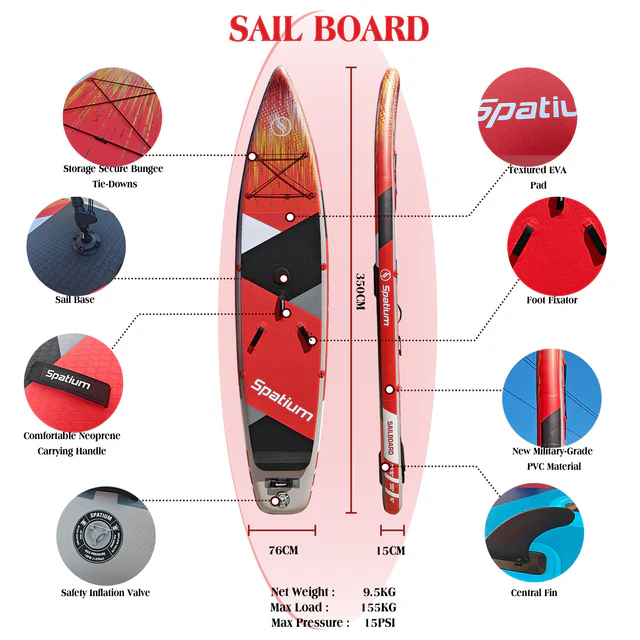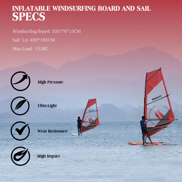 The Spatium Red Inflatable Windsurfing Board is designed to offer the flexibility of both windsurfing and paddleboarding, making it a hybrid favorite for casual watersport enthusiasts and travelers alike. Built with portability in mind, this combo pack includes both board and sail in a compact, inflatable form.